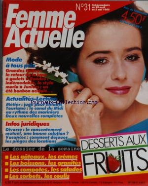 FEMME ACTUELLE [No 31] du 29/04/1985 - DESERT AUX FRUITS - MODE A TOUS PRIX - METIER - JUGE POUR ENFANTS - LE CANAL DU MIDI - DIVORCE - LE CONSENTEMENT MUTUEL - COMMENT DEJOUER LES PIEGES DES LOCATIONS - CUISINE La revue